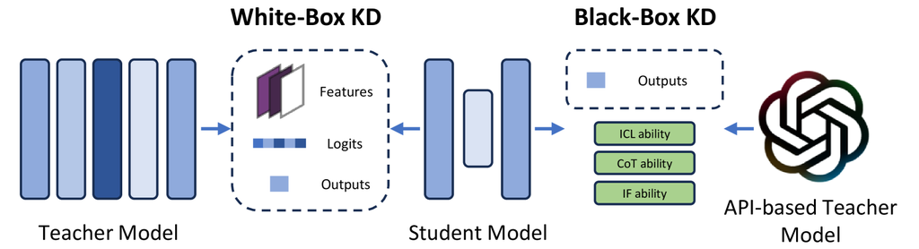 知识蒸馏 (KD) 是一种成熟的模型压缩技术,其中将知识从大型模型(称为教师模型)转移到小型模型(称为学生模型)。 在大语言模型(LLM)的背景下,KD 涉及使用原始 LLM 作为教师模型来蒸馏更小的 LM。 大量研究集中于将 LLM 的各种能力有效地转移到小型模型中。 在此领域,方法可分为两大类:白盒KD和黑盒KD。