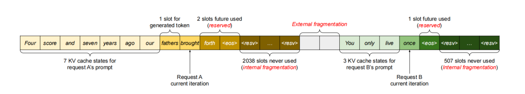 KV 缓存的存储占 LLM 服务内存使用量的主导地位,尤其是在上下文长度较长时。 由于生成长度不确定,因此提前为 KV 缓存存储分配空间具有挑战性。 早期的实现通常会根据每个请求预设的最大长度提前分配存储空间。 然而,在请求生成提前终止的情况下,这种方法会导致存储资源的大量浪费。针对这个问题,两个比较有名的推理框架vLLM和LightLLM分别做了以下解决: