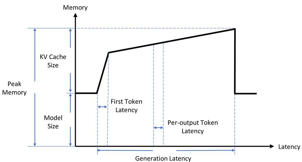 研究表明:影响大模型推理延迟方面的主要指标是计算成本、内存访问成本和内存使用量,而影响这三个指标低下的三个根本原因是:模型大小、注意力机制、解码机制。如下图所示,为一次生成过程中内存随时间变化(延迟)的示意图,表明Model Size、KV Cache Sizey对模型生成token的时延影响比较大(Peak Memory = Model Size + KV Cache)。