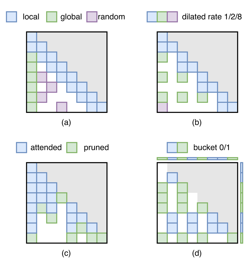 动态注意力剪枝: 如图 (d) 所示,这些方法不是移除某些 tokens 的所有注意力值,而是根据输入注意力动态选择性地移除部分注意力。 该领域的一个重要方法是将输入 tokens 动态分割成组,称为 buckets,并策略性地省略属于不同 buckets 的 tokens 的注意力计算。 这些方法的挑战和重点在于如何将相关的 tokens 聚类在一起,从而仅在它们之间进行注意力计算以提高效率。