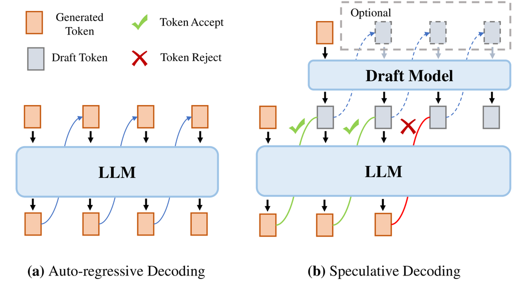 投机解码是一种创新的自回归 LLM 解码技术,旨在提高解码效率而不损害输出的保真度。 该方法的核心思想是使用一个较小的模型(称为草稿模型)来高效地预测多个后续 token,然后使用目标 LLM 并行地验证这些预测。 这种方法旨在使 LLM 能够在通常需要进行单次推理的时间内生成多个 token。投机解码方法包括两个步骤: