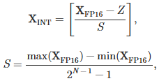 其中X(FP16) 表示 16 位浮点(FP16)值,X(INT) 表示低精度整数值,N 表示比特数,而 S 和 Z 表示缩放因子和零点。