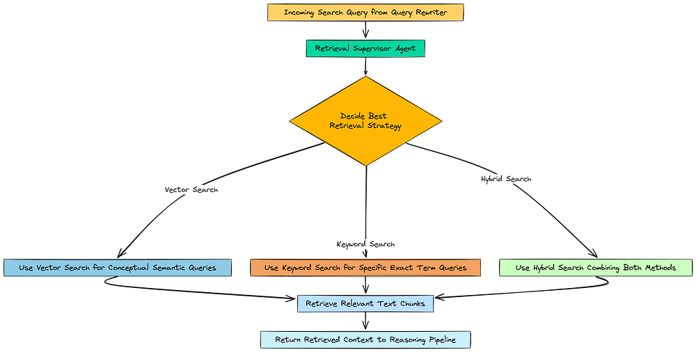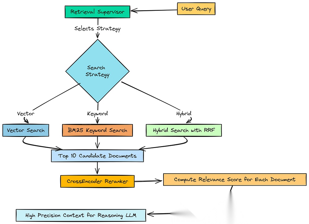 - 检索 (Retrieve): 对于每一步,它会执行一个自适应的多阶段检索漏斗,使用一个监督器(supervisor)来动态选择最佳的搜索策略(向量、关键词或混合搜索)。
