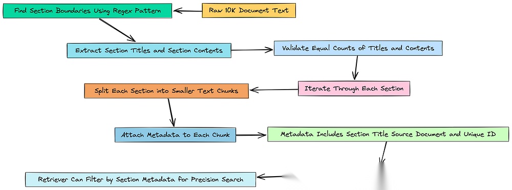 - • 加载并分块文档: 我们将摄入清理后的 10-K 文件,并将其分割成小的、固定大小的块——这是一种常见但在语义上较为粗糙的方法。