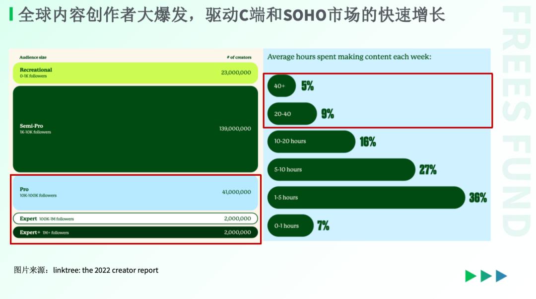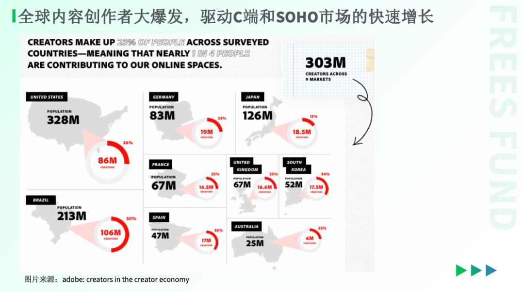 近年来,随着抖音、TikTok、B站、YouTube的高速发展, 全球内容创作者激增 。Adobe的一份创作者经济报告显示,自2020年以来,包含英美德日等全球九大国家的内容创作者已增长1.65亿人,截止2022年,其数量已达到 3.3亿人 (*这份报告没有对中国内容创作者进行统计。)