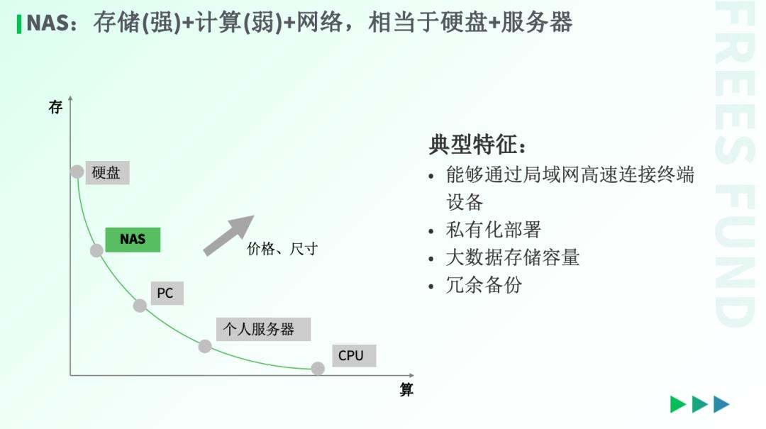 如果从算和存两个维度,把所有的相关设备放到相应的位置,它们的分布大概如下图。与硬盘比,NAS有更强的计算和传输能力;相较于PC(Personal Computer个人计算机),计算能力之外,它有更强的存储能力和传输能力。