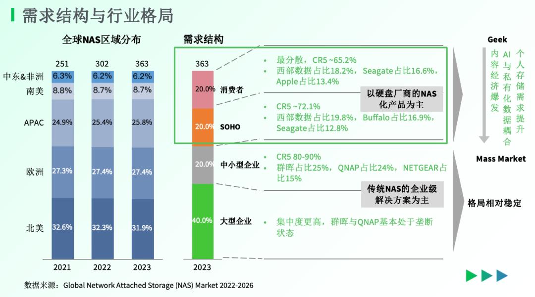 另外40%的市场主要由C端消费者和中小型工作室贡献。这部分市场相对分散,群晖等企业级玩家占有一定份额,一些硬盘厂商如西部数据也有一定市场占有率。这部分用户的典型画像是极客、家庭影院&高品质音乐的爱好者、工程师、内容创作者,他们有频繁调取大尺寸文件的需求,且对传输速度有较高的要求。然而,这些需求并不能被当下的NAS产品所满足,驱动着NAS市场诞生新的机会。