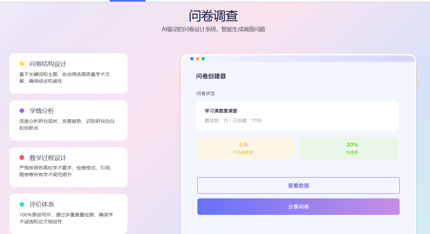 毕业论文是学术生涯的重要里程碑,而调查问卷往往是其中不可或缺的一环。面对这一挑战,毕业生们不再需要孤军奋战。在AI的辅助下,我们可以将更多精力投入到研究问题的深度思考和创新探索中,而不是被繁琐的技术细节所困扰。这正是技术赋能学术研究的真正意义所在。