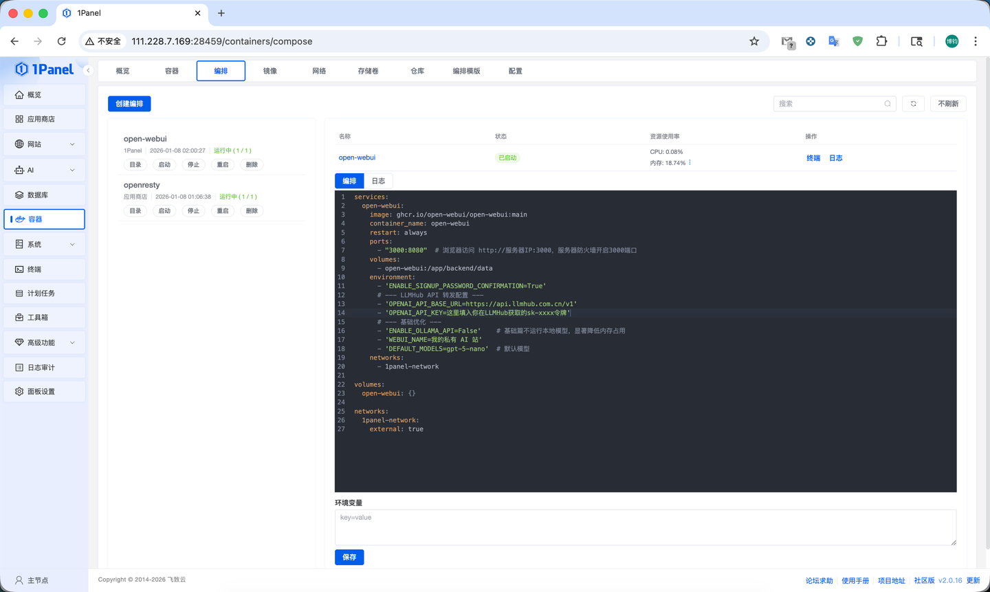 自动重启:1Panel 会确保你的 AI 站 7x24 小时在线,即便服务器重启,容器也会自动拉起。