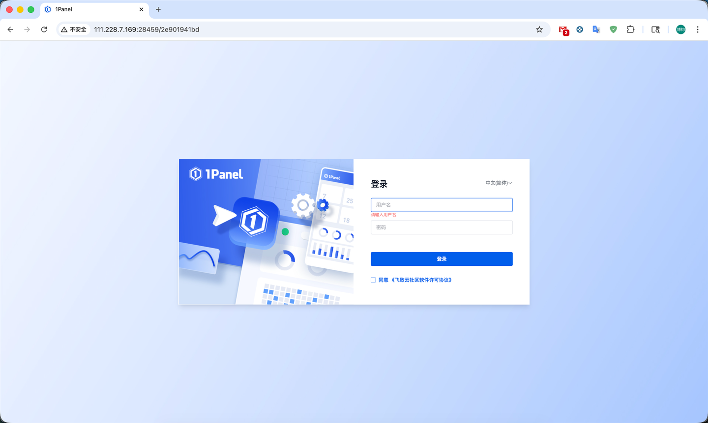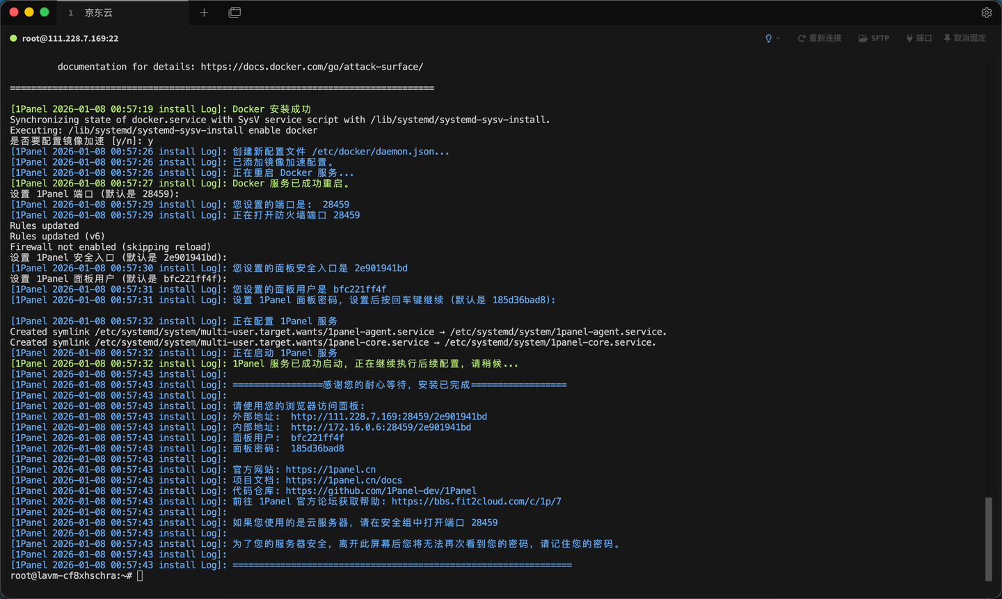 安装完成后,终端会显示面板的 访问地址、用户名和密码。请在浏览器登录并进入面板。