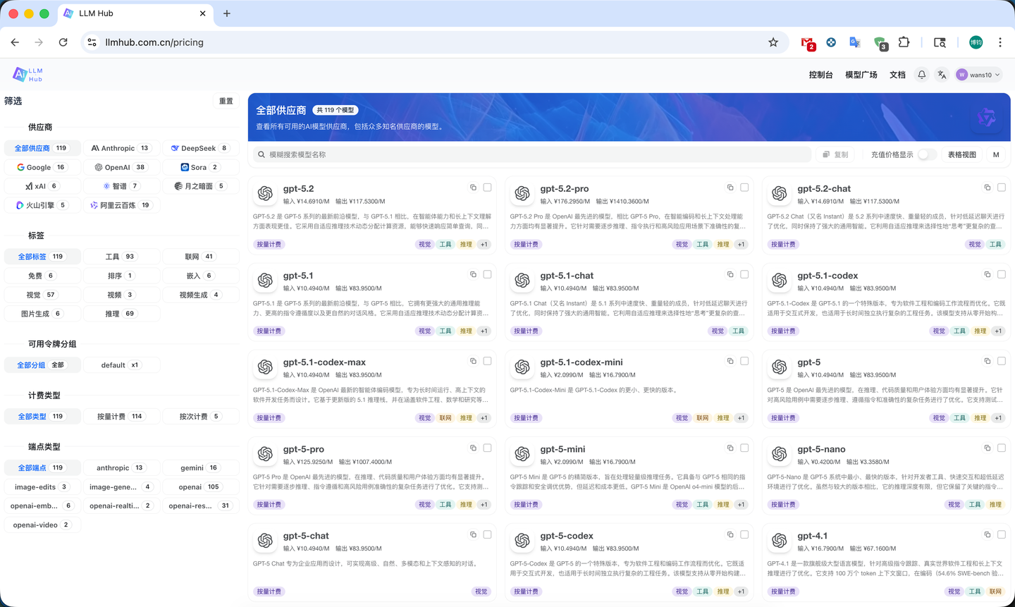 访问官网:打开 llmhub.com.cn,你会看到极简的集成平台界面。