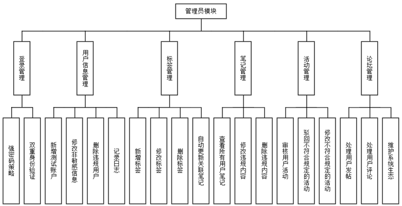 管理员登录采用强密码策略,密码需包含大小写字母、数字和特殊字符且长度不少于12位,并结合双重身份验证(短信验证码或动态令牌)。用户信息管理模块可新增测试账户,修改用户非敏感信息,对违规用户执行删除操作并记录日志。标签管理支持新增、修改、删除标签,修改标签时自动更新关联笔记。笔记管理可查看所有用户笔记,对违规内容进行修改或删除;活动管理审核用户发起的活动,不符合规定的进行驳回或修改;论坛管理处理用户发帖和评论,维护系统生态。功能模块图如