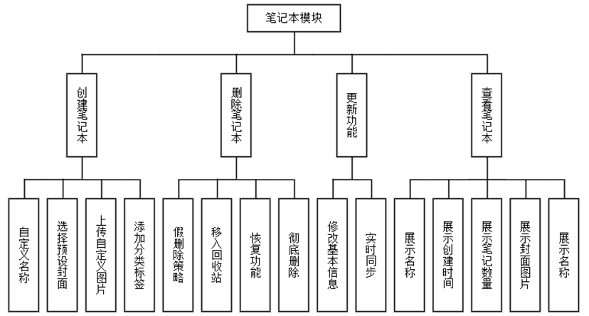 创建笔记本时,用户可自定义名称、选择预设封面或上传自定义图片,并添加分类标签。系统对名称长度限制为不超过30个字符,标签数量不超过10个。删除笔记本时,采用“假删除”策略,将笔记本标记为删除状态并移入回收站,用户可在7天内恢复,7天后彻底删除相关数据。更新功能支持修改笔记本的基本信息,修改后实时同步至本地数据库和云端。查看笔记本时,列表模式展示名称、创建时间和笔记数量,缩略图模式则以封面图片配合名称呈现,方便用户快速定位。功能模块图如