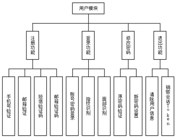 用户模块旨在保障用户账户安全与便捷使用,注册功能支持手机号、邮箱两种方式,结合验证码验证机制,确保账户真实性;登录采用账号密码、指纹识别、面部识别等多种方式,兼顾安全与效率;修改密码时需进行身份二次验证,防止账户被盗用;退出功能则安全清除当前设备登录状态。