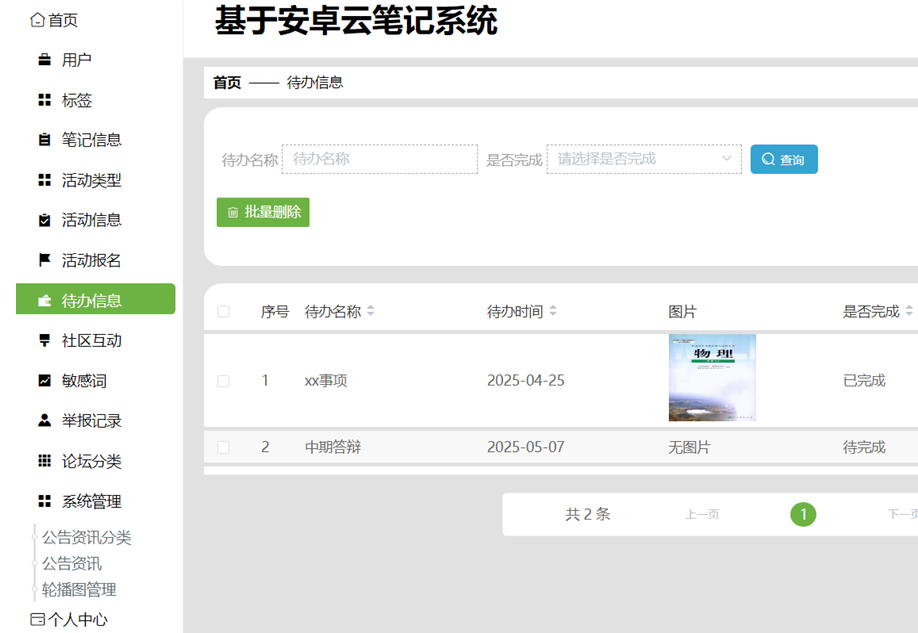 对于笔记管理、活动管理与论坛管理功能,管理员有权对用户发布的内容进行审核、修改或删除。通过这些操作,管理员能够维护系统内容的合规性,确保平台上的信息健康、积极。