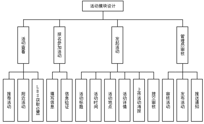 活动查看页面展示系统推荐和附近的活动,通过LBS(基于位置服务)获取用户位置,推荐周边活动。用户报名参加活动时,填写必要信息后提交,系统验证信息完整性和有效性。发起活动功能中,用户填写活动标题、时间、地点、详情等内容,上传活动海报,提交后进入审核流程。管理员审核通过后,活动正式发布,系统通过推送通知告知关注该类活动的用户。功能模块图如