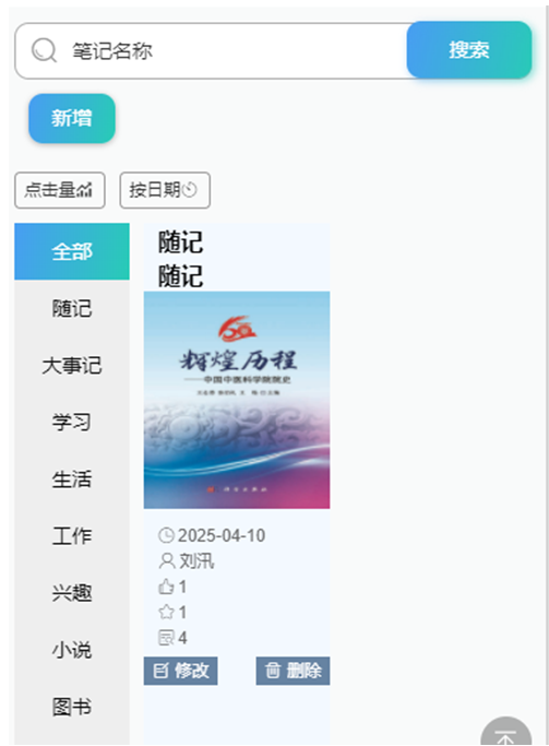在查看收藏列表时,系统支持用户按照时间、标签等多种条件进行筛选,帮助用户快速找到所需的笔记。此外,搜索功能利用Elasticsearch实现全文检索,能够快速且精准地定位用户所需的笔记,大大提高了用户查找笔记的效率。相关的实现图如图