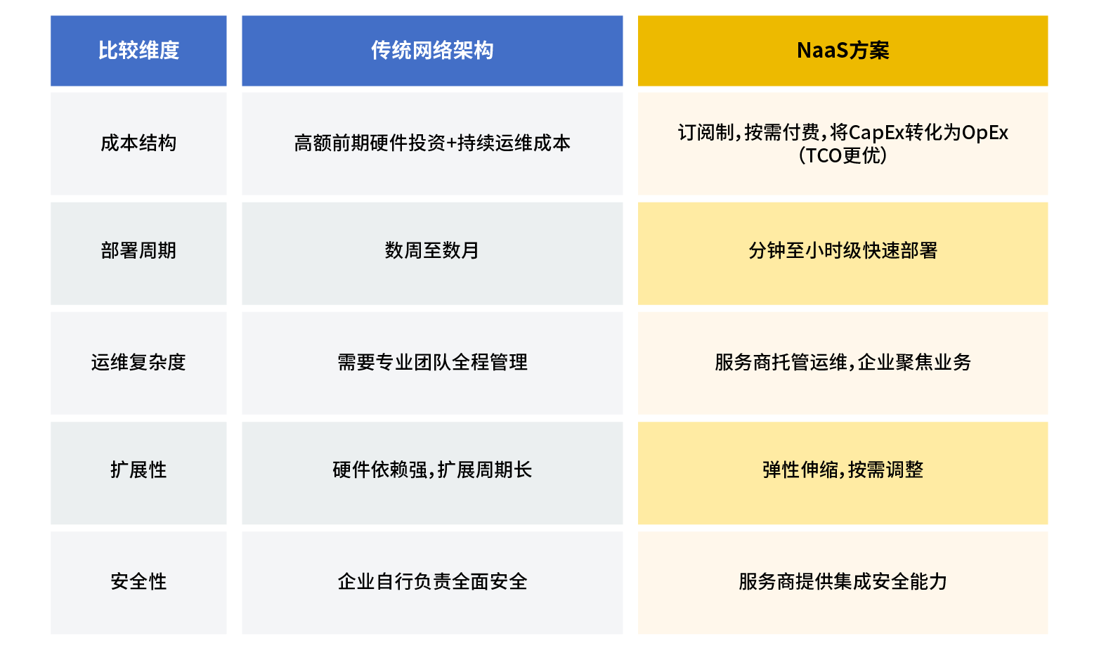 下表清晰展示了NaaS与传统网络在企业核心考量维度上的差异: