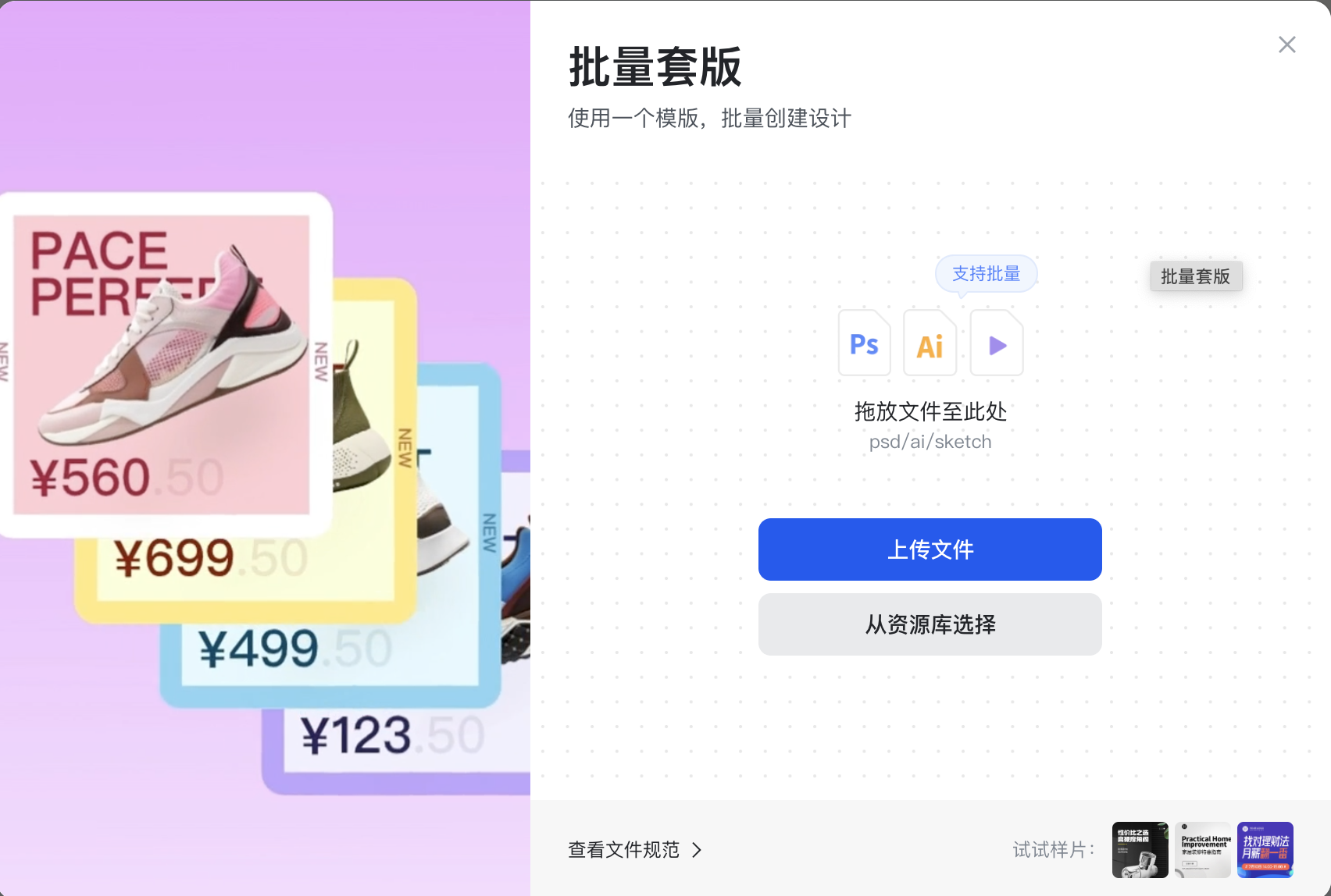 对于多SKU的商家,批量生成主图是提升效率的关键。传统方式下,设计一个SKU的主图需要30分钟,100个SKU需要50小时;而稿定设计的“批量处理”功能可将时间缩短至2小时:通过“批量抠图”、“批量套版”、“批量添加水印”,实现“一变多”的高效生产。
