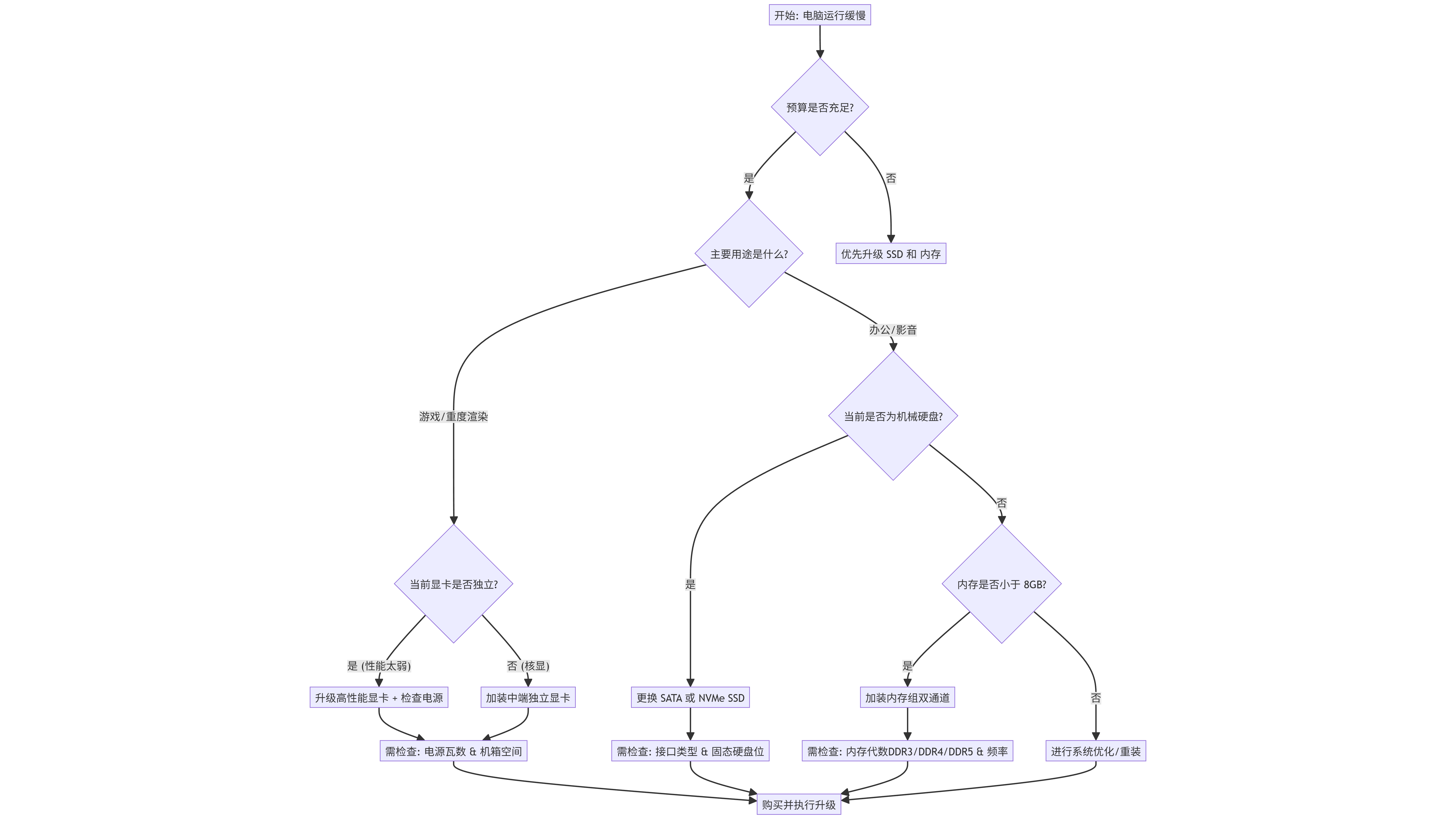 A[开始: 电脑运行缓慢] --> B{预算是否充足?}