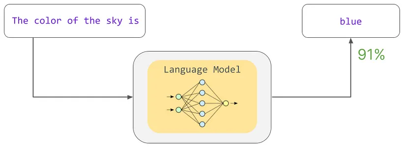 语言模型可以根据其在训练过程中学习到的统计模式,预测最可能跟随某个短语的单词(或多个单词)。在图中,语言模型可能会估计“天空的颜色是”这个短语后面跟着“蓝色”一词的概率为91%。