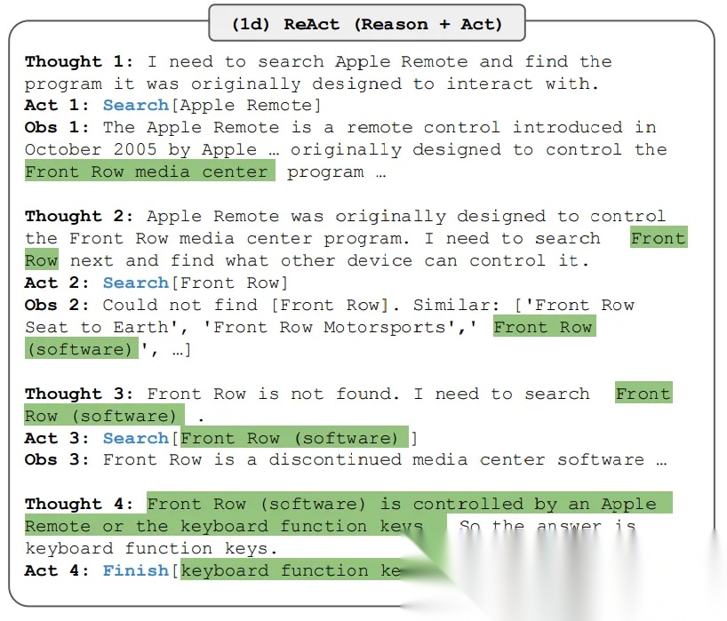 ReAct是一种将推理和行动与大语言模型相结合的通用范式。ReAct促使大语言模型为任务生成语言推理轨迹和行动。这使系统能够进行动态推理,创建、维护和调整行动方案,同时还能与外部环境(例如维基百科)进行交互,将更多信息纳入推理过程。下图展示了ReAct的一个示例以及执行问答任务所涉及的不同步骤。