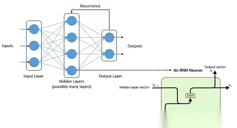 通常,自监督学习算法使用基于人工神经网络(ANN)的模型。我们可以使用几种架构来创建人工神经网络,但大语言模型中使用最广泛的架构是循环神经网络(RNN)。