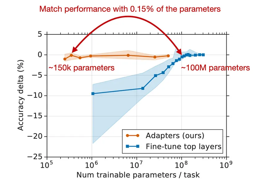 适配器是最早发布的参数高效微调技术之一。相关论文Parameter-Efficient Transfer Learning for NLP表明,我们可以在现有的Transformer架构上添加更多层,并且只对这些层进行微调,而不是对整个模型进行微调。他们发现,与完全微调相比,这种技术可以产生相似的性能。