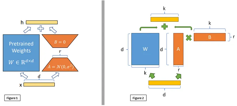 图2展示了矩阵 和 的维度为 ,而我们可以改变 r 的值。 r 值越小,需要调整的参数就越少。虽然这会缩短训练时间,但r值过小时也可能导致信息丢失并降低模型性能。然而,使用LoRA时,即使秩较低,性能也能与完全训练的模型相当甚至更好。