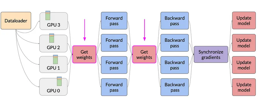 全分片数据并行(FSDP)通过在多个GPU之间分布(分片)模型参数、梯度和优化器状态来减少内存使用。
