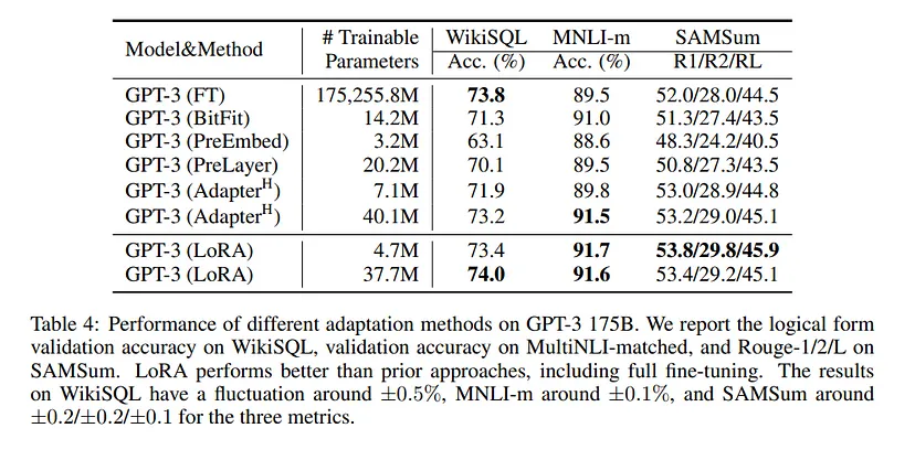 以GPT-3 175B为例,LoRA研究团队证明,即使全秩(即d)高达12288,非常低的秩(即图1中的r可以是1或2)也足够了,这使得LoRA在存储和计算上都非常高效。