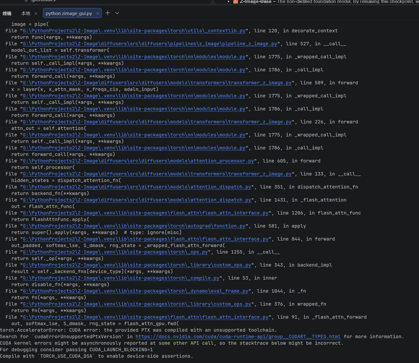 如果你在使用 Z-Image、Stable Diffusion 或其他依赖 Flash Attention 2.x 的项目时,模型加载正常(甚至提示 “✅ 已成功启用本地 Flash Attention 加速!”),但第一次生成图像就崩溃,报错如下: