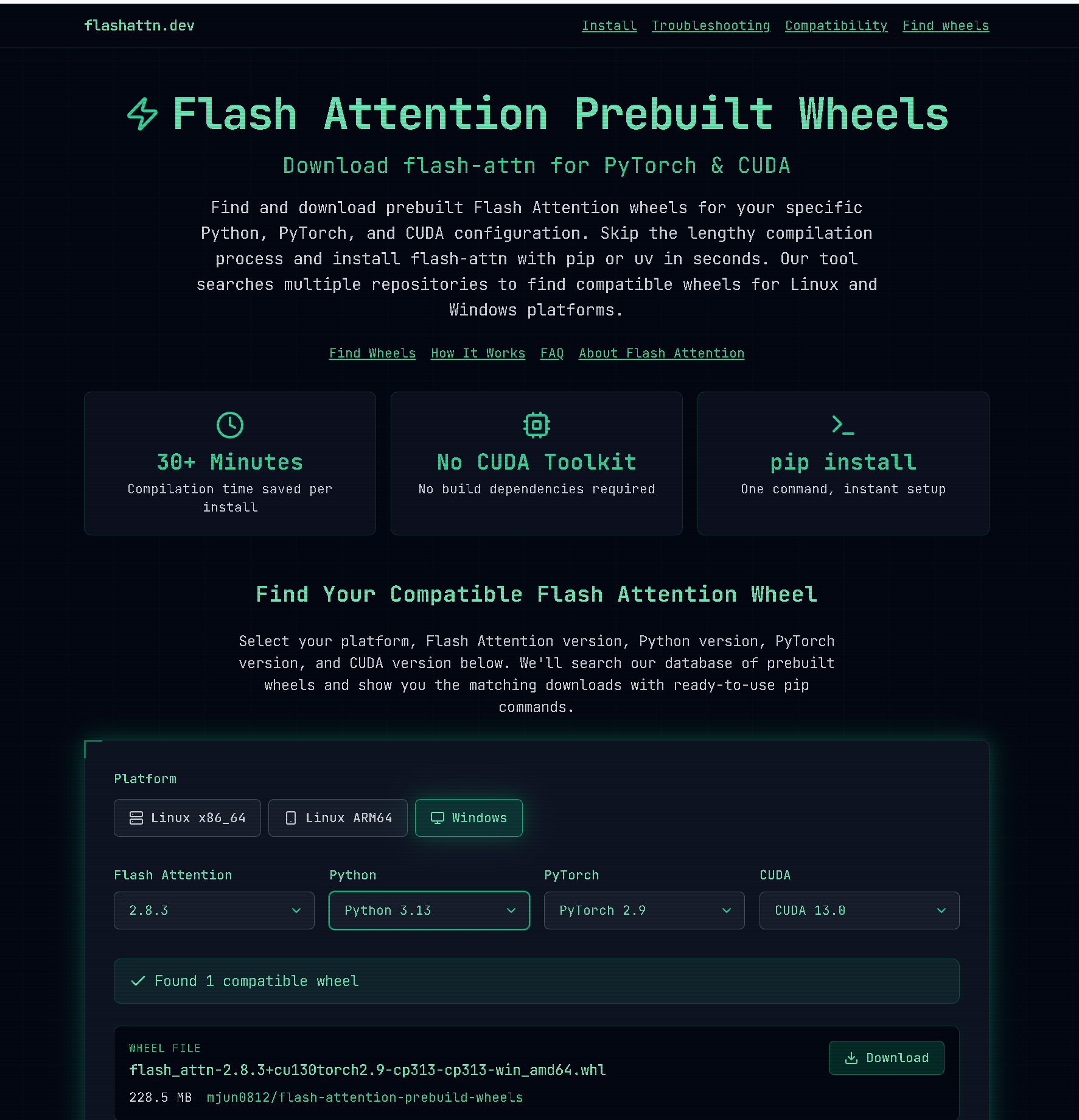 - 常见环境:Windows 11 + RTX 3090/4090 + PyTorch 2.9.x + CUDA Toolkit 13.x + Flash Attention 2.8.3