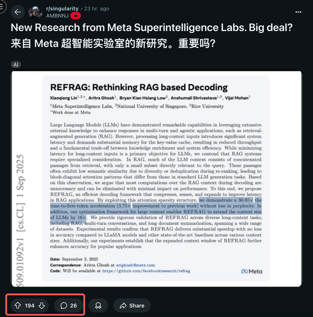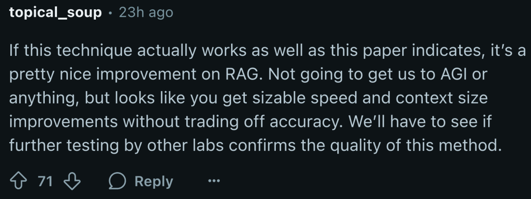 比如Reddit上的技术网友直言:“如果实测效果能匹配论文描述,这绝对是RAG领域的里程碑级改进——既能大幅提升响应速度、扩容上下文窗口,还不牺牲答案准确性,完全戳中了工业落地的核心痛点。”