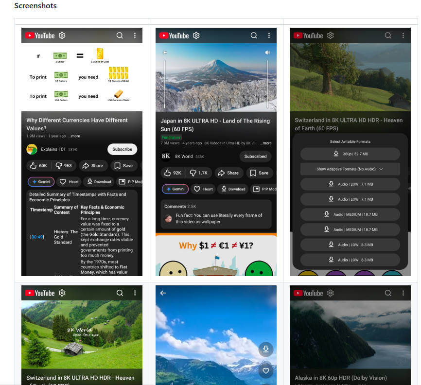 | 📝 核心功能 | 改进版 YouTube 客户端,支持旧版 Android、后台播放等。 | |