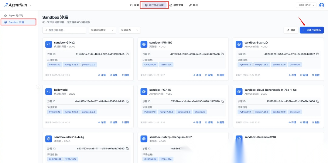 点击右上角“创建沙箱模板”;