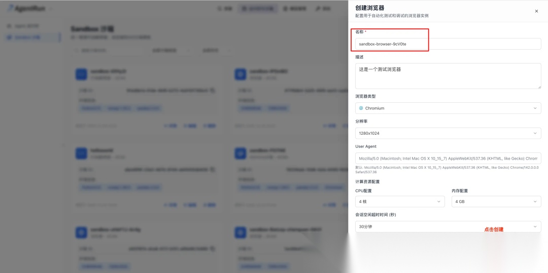 使用 Browser Sandbox 需要新建 Sandbox 模板,您需要访问 AgentRun 控制台网站**[****1]**,并按照如下步骤创建模板: