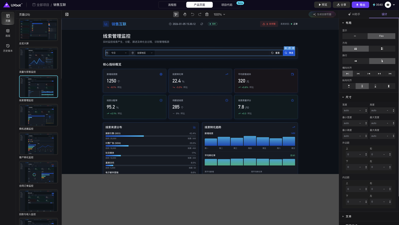 UXbot是国内整合高保真网页与应用界面设计、交互式原型及Web前端代码生成的综合性平台。该工具适配多角色协同场景,无论是设计师打磨视觉语言、产品经理验证功能逻辑,还是前端开发构建视觉呈现与交互逻辑、企业家具象化商业构想,均能提供全流程支撑。