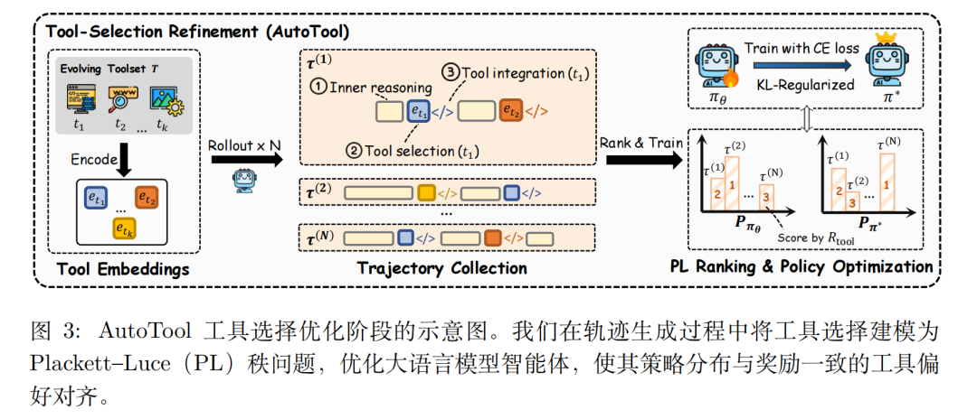 核心:聚焦工具选择步骤优化,而非全轨迹优化。关键创新是引入KL 正则化的 Plackett-Luce(PL)排序,将工具选择转化为 “基于奖励的排序问题”。