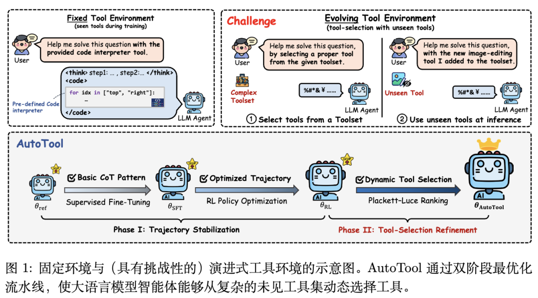 TLDR:提出了一种新框架 AutoTool,让大语言模型(LLM)在“思考”过程中像人类一样动态挑选并调用外部工具(如代码解释器、搜索引擎、图像识别模块等),而不是只能使用固定的那几个工具。