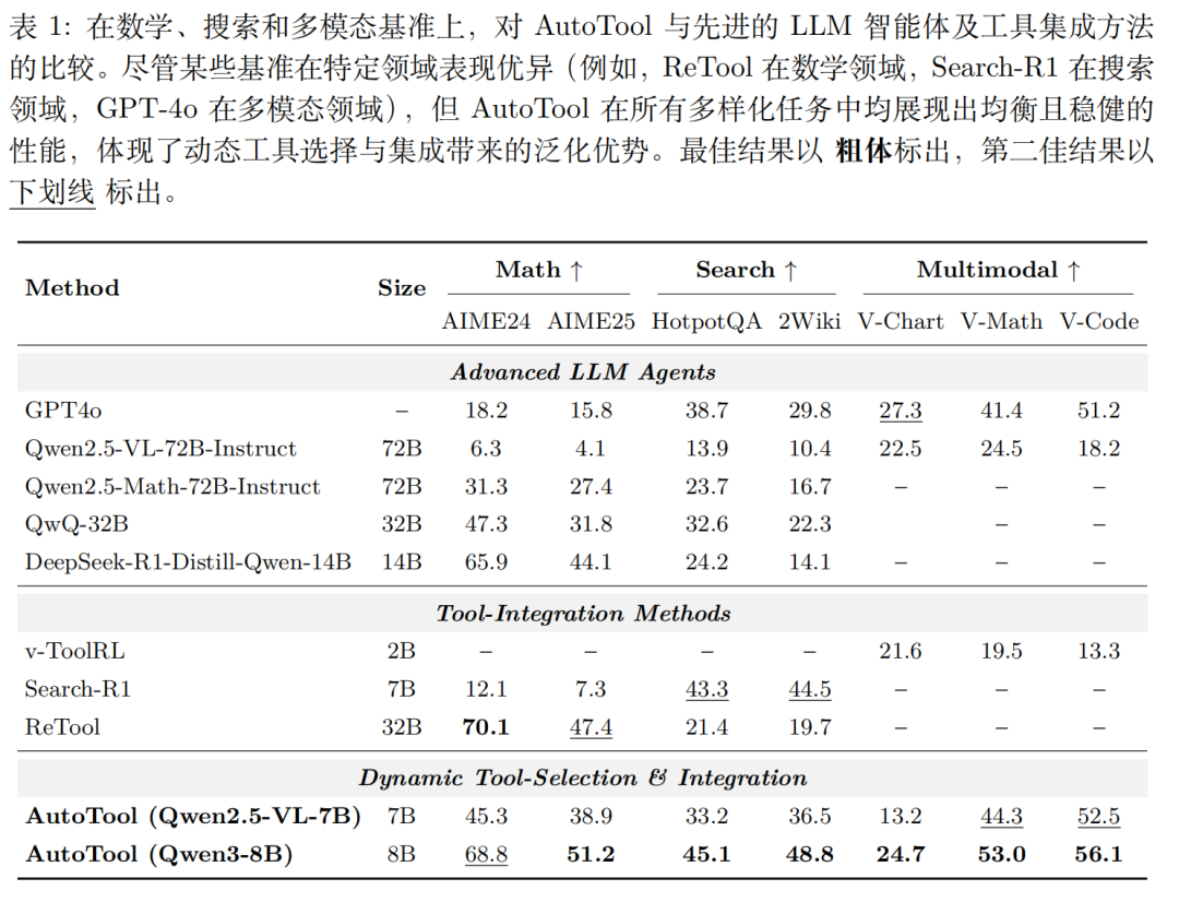 在 Qwen3-8B 和 Qwen2.5-VL-7B 基础上实现了 AutoTool,并取得了显著成果: