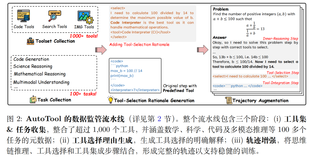 - 工具选择理由生成:用专家模型(DeepSeek-R1)为每个工具调用步骤添加 “选择rationale”(比如 “需要计算 100÷14,代码解释器能精准处理数学运算”),让模型理解 “为何选该工具”。