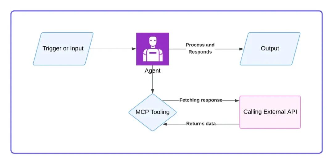 您不会希望通过硬编码每个API交互的方式,来确保此过程在智能体内可靠运行。相反,您可以引入一个MCP(模型上下文协议)层——MCP是一种用于标准化访问外部工具和服务的协议。MCP层代表了工具接口层,所有外部交互(主要是API)在此抽象和维护。如此一来,核心逻辑保留在智能体内部,而繁重的工作则委托给工具处理。