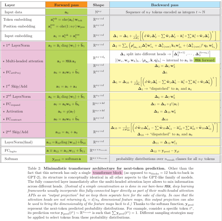 论文在 Table 3 中汇总了所有层的梯度公式。这不仅仅是一个结果表格,更是对全文推导的验证。它清晰地列出了从输出层(Logits)一直反向传播到输入嵌入层所需的每一个数学运算步骤,证明了手动反向传播的可行性。