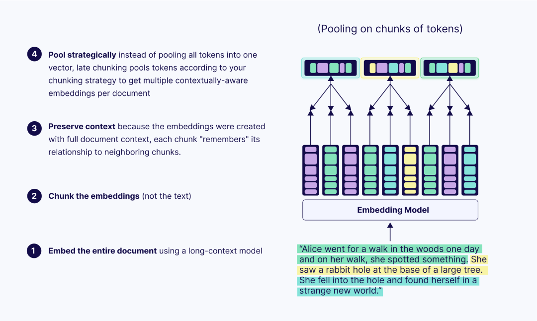 后期分块反其道而行之。你不是先分割,而是首先将整个文档输入到一个长上下文嵌入模型中。这创建了详细的、Token 级别的嵌入,能够理解全貌。只有在那之后,你才将文档分割成块。