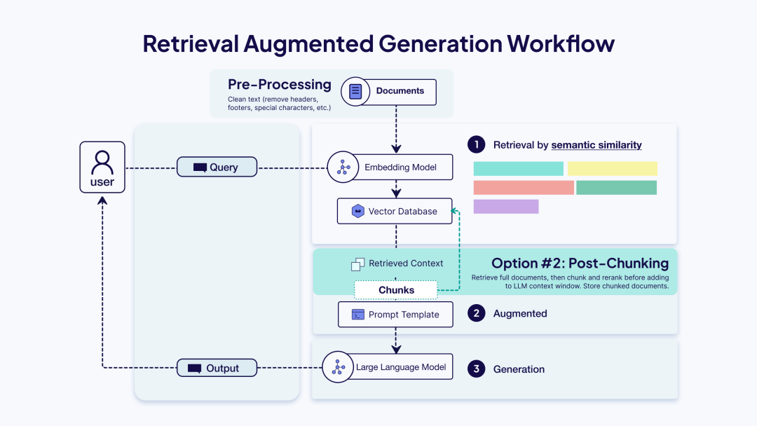 | 后期 (Late) | 先嵌入整个文档,然后从中推导分块嵌入。 | 高 | 分块需要感知完整文档上下文的用例。 | 案例研究、综合手册、长篇分析报告 |
