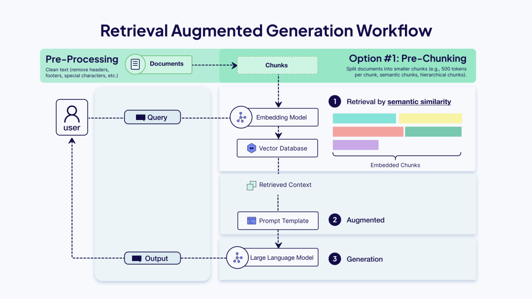 预分块是最常见的方法。它异步处理文档,在嵌入和存储到向量数据库之前将它们分解成更小的部分。这种方法需要预先决定分块的大小和边界,但由于所有分块都是预先计算和建立索引的,因此能够在查询时实现快速检索。