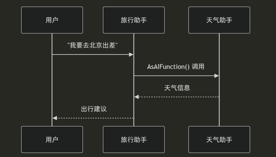 // 1️⃣ 创建子 Agent(天气助手)var weatherAgent = chatClient.CreateAIAgent( instructions: "你是天气查询助手", name: "WeatherAgent", tools: [AIFunctionFactory.Create(GetWeather)]);// 2️⃣ 转换为 AIFunctionvar weatherFunction = weatherAgent.AsAIFunction();// 3️⃣ 注册到主 Agentvar travelAgent = chatClient.CreateAIAgent( instructions: "你是旅行助手,可以调用天气助手查询天气", name: "TravelAgent", tools: [weatherFunction] // 注册子 Agent 作为工具);