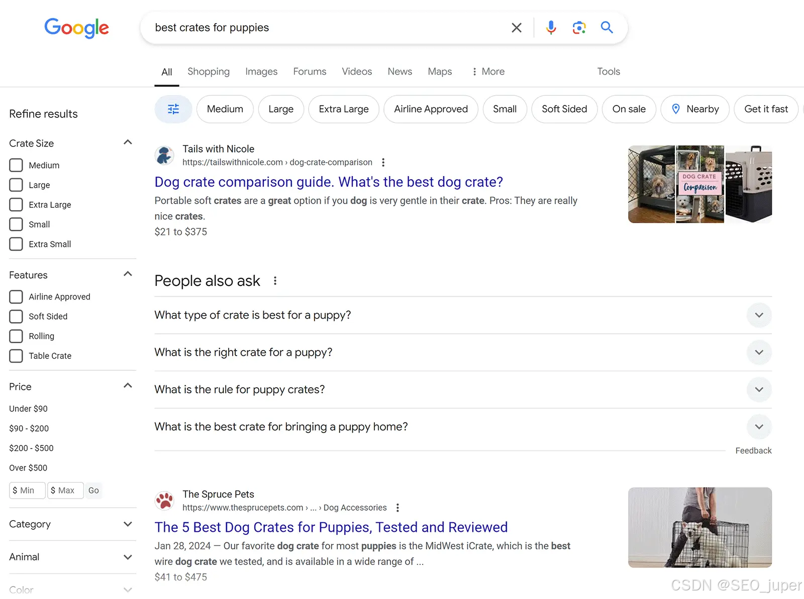 拿这个和另一个例子做对比。当你搜索“最佳幼犬笼舍”时,谷歌会显示对比指南和类似列表的博客文章。
