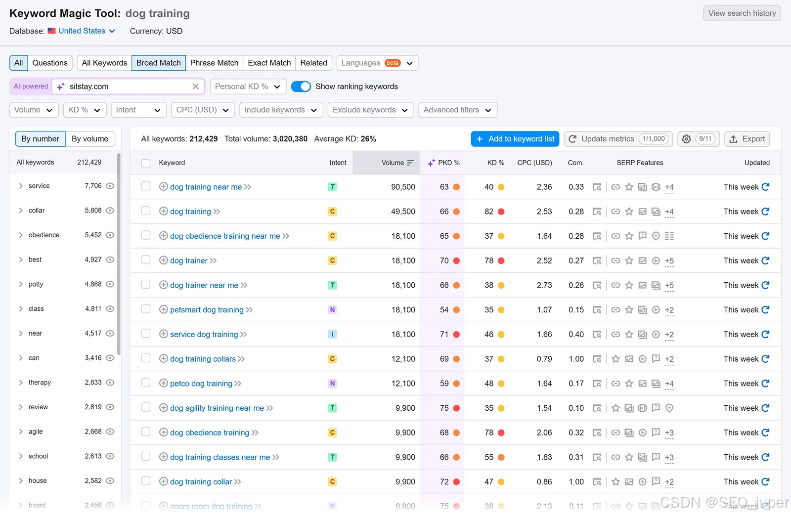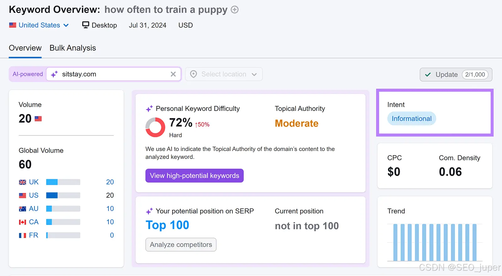 - 个人关键词难度(Personal Keyword Difficulty, PKD%): 基于您当前网站权重及与竞争对手的相关性对比,该关键词对您网站获得良好排名的难度。百分比越高,该关键词的排名难度可能越大。